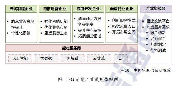 5G消息为全产业链发展提供新动能。近年来以5G、大数据、人工智能等为代表的新一代信息技术加速创新应用,推动经济社会各领域向数字化、智能化、网络化发展。5G消息正是在信息技术处在重大变革期时出现的新业态,给信息服务业产业链各方提供了新的发展赛道,为日趋饱和的消息服务市场提供了新的增长点。5G消息产业链参与方主要包括电信运营企业、应用开发企业、终端制造企业、垂直行业企业。对于电信运营企业来说,借助5G消息升级,可以对短消息业务基础设施进行升级换代,通过核心网功能网元虚拟化(Network functions virtualization, NFV) 等策略, 加强系统的稳定性和可扩展性,在此基础上,持续优化消息业务布局,通过创新服务发展增量带来消息业务收入提升。对于应用开发企业来说,传统应用服务提供商(Service Provider,SP) 企业通过5G消息由通道商变为服务提供商,可以有效提升行业客户粘性,避免低水平价格战造成的“内卷式”竞争;新进开发企业可以依靠原有业务积累,通过贴近细分行业场景拓展更多细分领域,重构价值创造模式。对于终端企业来说,5G消息毫无疑问地成为其进入消息产业链的最佳途径,借助5G消息终端增强等服务,提升企业服务的盈利能力,改变终端企业依赖IP消息、智能短信等非标业务盈利的不稳定模式;5G消息依赖终端支持,标准化能力以外的个性化行业消息服务,可以为终端带来增值收益。对于垂直行业企业来说,可利用已有的移动端服务经验进行5G消息实践,通过5G消息产业链企业提供的人工智能能力和大数据积累,快速实现消息按需投放,构建全新的信息服务生态与流量入口,并在消息内完成私域服务闭环,避免用户在应用切换间流失。综上,5G消息将成为产业链企业转型升级、提升竞争力的重要途径。