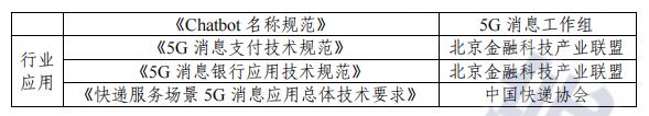 在标准化层面,目前我国5G消息相关标准项目研究在中国通信标准化协会(CCSA) 的多个工作组以及行业组织内共同开展, 主要内容与方向包括:总体要求、业务功能要求、终端要求、支撑保障、安全合规、行业应用等方面,基础通用类标准已基本完善,具体如表1所示。