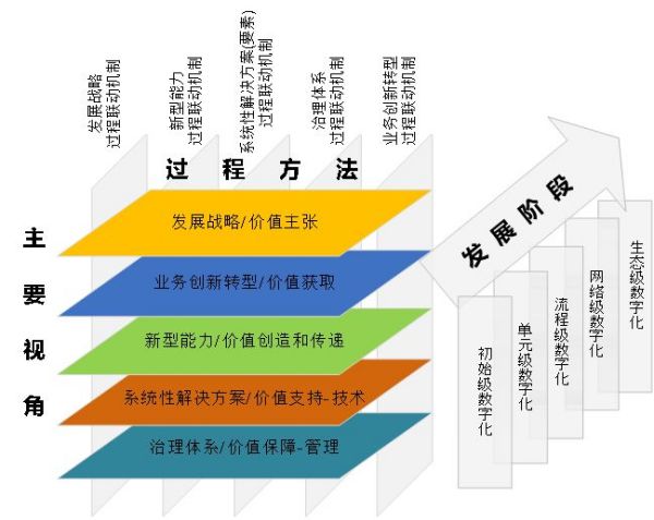 数字化转型参考架构的总体框架,如图所示,主要针对 “做什么”、“怎么做”和“路线图”,提出了数字化转型的主要视角、过程方法和发展阶段,系统阐释了数字化转型的主要任务、过程联动机制和分步实施要求。