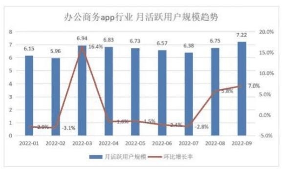 据QuestMobile最新报告数据显示,截至2022年9月,办公商务行业整体月活跃用户规模首次突破7亿,同比增长高达16.7%,该增速在中国移动互联网19个一级行业中排名第二。即使在恢复线下办公后,我国商务办公APP行业仍保持增长态势。