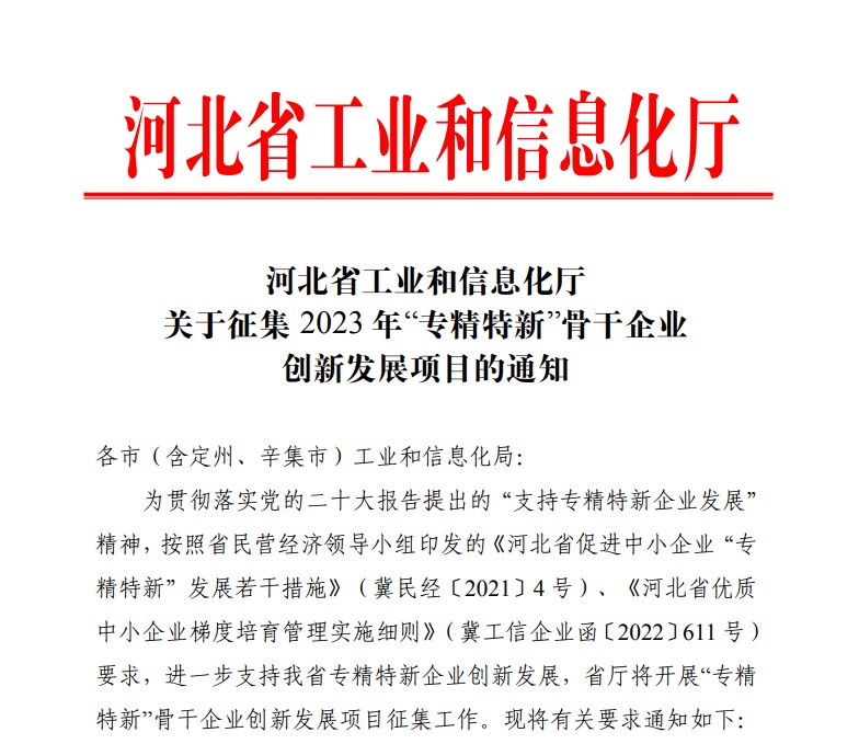 原文:关于征集2023年“专精特新”骨干企业创新发展项目的通知 https://gxt.hebei.gov.cn/hbgyhxxht/xwzx32/tzgg83/920791/index.html