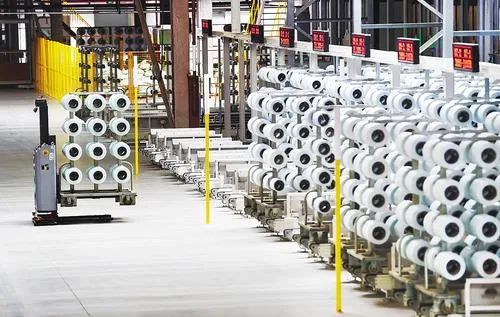 河北冀中新材料有限公司烘干车间,智能搬运机器人在运送玻纤产品