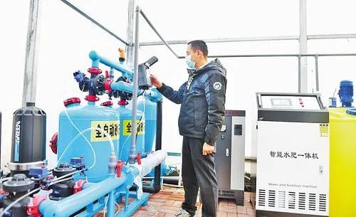 日前,在平乡县柴口股份经济合作社种植基地的温室大棚,村民在调试智能水肥一体机