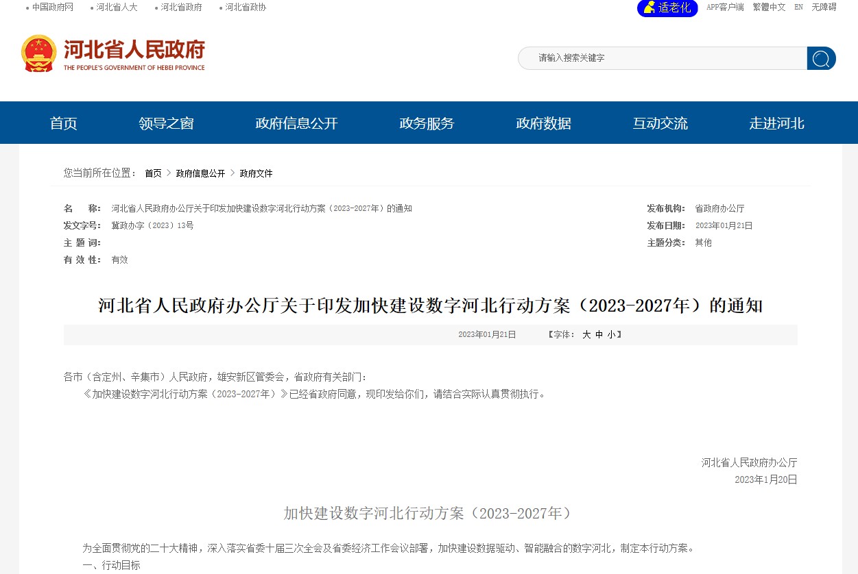 原文:河北省人民政府办公厅关于印发加快建设数字河北行动方案(2023-2027年)的通知 http://info.hebei.gov.cn/eportal/ui?pageId=6806152&articleKey=7055187&columnId=6806589