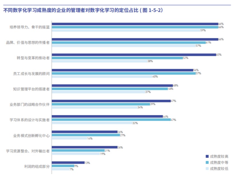 数字化学习成熟度较高的企业,管理者将数字化学习作为战略转型与组织变革的推动者比例显著高于数字化 成熟度较低的企业。