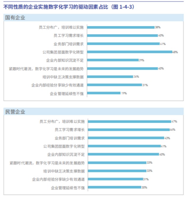 除员工分布广,培训难以实施和员工学习需求增长之外,业务部门培训需求成为 民营企业实施数字化学习的第三大驱动因素。相对而言,国有企业实施数字化学 习的首要驱动因素为公司集团层面数字化转型,占比为48%。