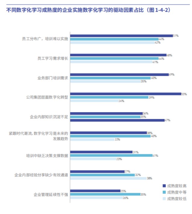 数字化学习成熟度高的企业将公司层面数字化转型视为首要的驱动因素,其次是员 工分布广培训难以实施,业务部门培训需求成为该类企业实施数字化学习的第三大 驱动因素。