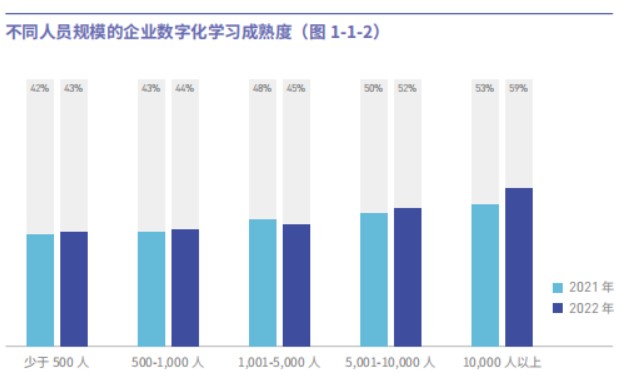 企业规模越大,数字化学习成熟度越高。相比去年,5000人以上中、大型企业数 字化学习成熟度同比增幅高于其他企业。
