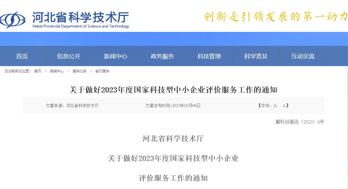 原文:关于做好2023年度国家科技型中小企业评价服务工作的通知 https://kjt.hebei.gov.cn/www/xwzx15/tzgg35/sttz15/278908/index.html