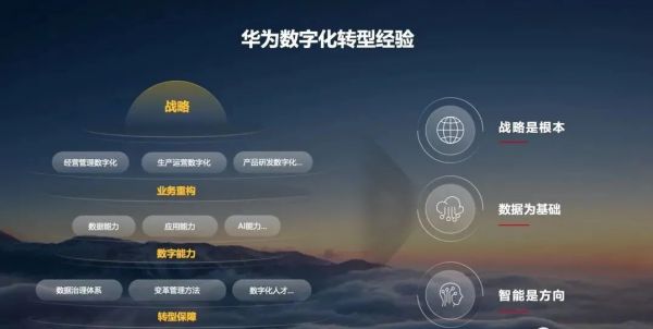 在近10年的持续变革中,研发、制造、销售、交付、财经等领域,都通过数字化转型得到了极大的能力提升。在我们看来,对数字化转型而言:战略驱动是根本、数据治理是基础、数据智能是方向。