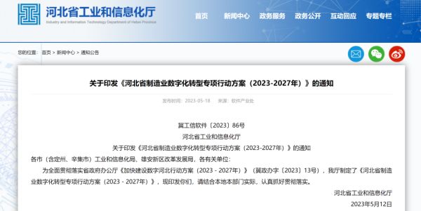 原文:关于印发《河北省制造业数字化转型专项行动方案(2023-2027年)》的通知 http://gxt.hebei.gov.cn/hbgyhxxht/xwzx32/tzgg83/931656/index.html