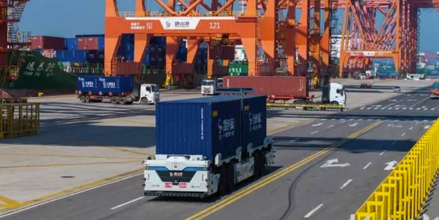 7月16日,唐山港京唐港区,新一代重型智能平板运输车在码头上穿行。