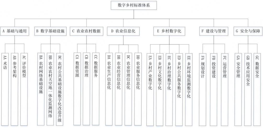 其中,A基础与通用标准主要围绕术语、参考架构、评价模型等方面,为乡村数字基础设施、农业农村数据和应用 领域标准提供运作框架。