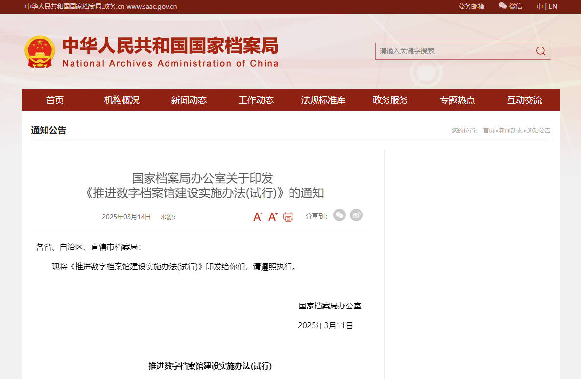 政策原文:国家档案局办公室关于印发《推进数字档案馆建设实施办法(试行)》的通知 - 中华人民共和国国家档案局 https://www.saac.gov.cn/daj/tzgg/202503/3d1cbfbab73f4738985c25c49303bcb5.shtml?from=singlemessage