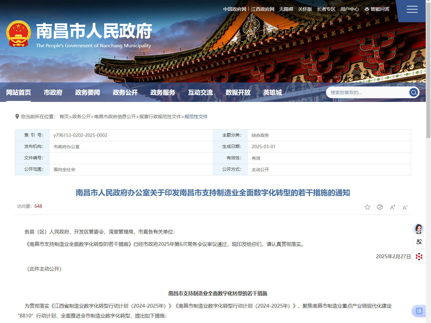 政策原文:南昌市人民政府办公室关于印发南昌市支持制造业全面数字化转型的若干措施的通知 - 南昌市人民政府 http://www.nc.gov.cn/ncszf/gfxwj/202503/f6ac6fd1a9564273b3c53fcba39e71c9.shtml