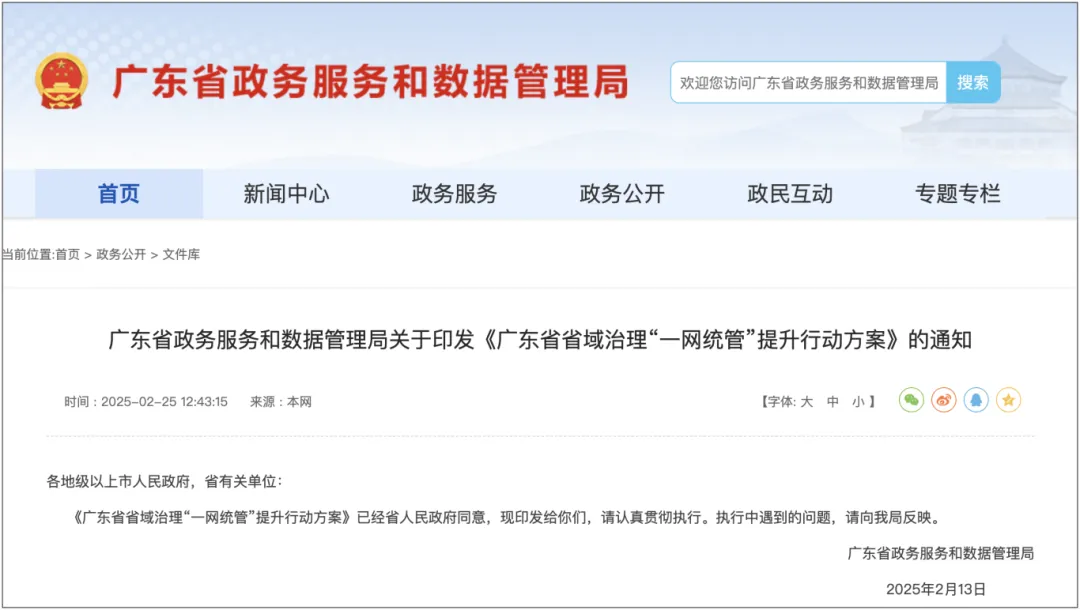 近日,广东省政务服务和数据管理局印发《广东省省域治理“一网统管”提升行动方案》(简称《行动方案》),提出要在省域治理“一网统管”三年行动基础上,进一步强化数据驱动,提升共性基础能力,夯实数字化支撑体系,深化多跨业务协同,推动治理场景创新,不断拓展“一网统管”广度和深度,为城市全域数字化转型提供强大动能。