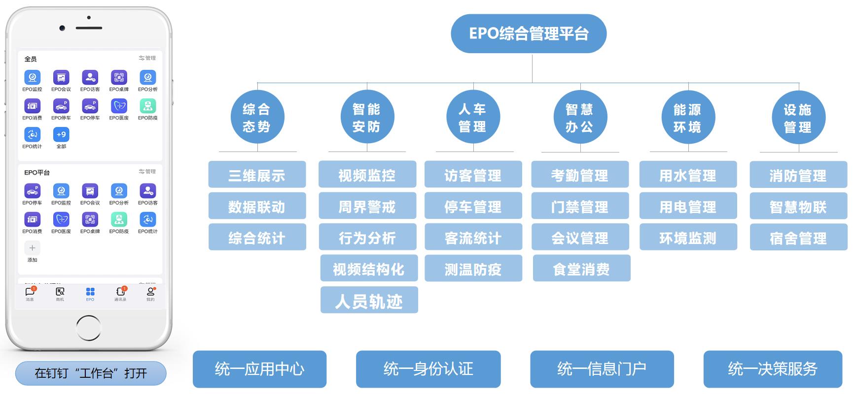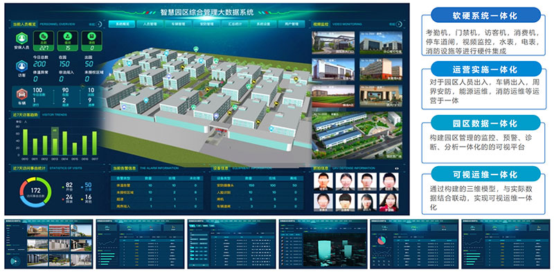 以物联网、云计算、大数据等新一代信息技术为支撑,基于钉钉平台打造,以3D虚拟化技术为基础,集成视频监控,考勤,门禁,会议,访客,停车,消费,AI分析,能耗监控,消防监控等应用,构建园区管理、监控、预警、诊断、分析于一体的可视、可查、可管、可信的一体化的可视平台。